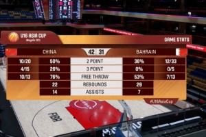 体育资讯9月5日讯 U16男篮亚洲杯1/4决赛,中国队半场42-31领先巴林队。