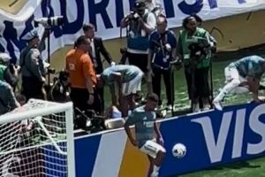 比赛开始之前,一名志愿者因高温中暑,姆巴佩在场边为其提供帮助。