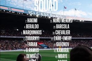 巴黎对阵昂热大名单:登贝莱领衔,多纳鲁马、K77缺席