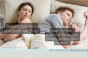 赫伊森贴出的图片中有一对情侣,其中那个男的显然是一个西班牙球迷,他纠结于赫伊森名字的发音(注:赫伊森是小时候从荷兰移居到西班牙的,他这个姓氏在西班牙很罕见,而荷兰语和西班牙语的发音有很大差别):“这个名字该怎么念呢?豪森,哈德森,丹-华森...", 他身旁的女友怀疑他有外遇了:“他肯定在想别的女孩..."