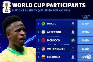 当前位置: 首页 > 资讯 > 足球资讯 > 目前晋级世界杯球队身价:巴西、阿根廷前二,佛得角第20位